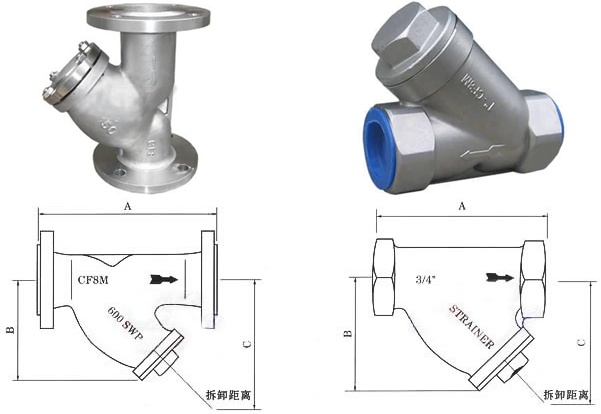 | 口徑 (in) | ANSI法蘭連接 | 螺紋連接 | B | C | 濾網面積cm2 | ||